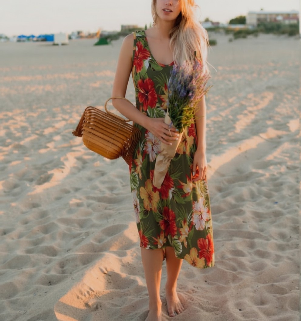 Tunique ample aux motifs estivals, taille unique. Parfaite pour les journées ensoleillées et les soirées d'été.
